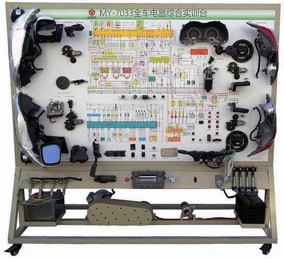 該設(shè)備采用全新桑塔納2000整車電器實物為基礎(chǔ),充分展示汽車發(fā)動機防盜系統(tǒng)、儀表系統(tǒng)、燈光系統(tǒng)、雨刮系統(tǒng)、喇叭系統(tǒng)、點火系統(tǒng)、電動車窗系統(tǒng)、電動門鎖、音響系統(tǒng)、起動系統(tǒng)和充電系統(tǒng)等汽車電器各系統(tǒng)的組成結(jié)構(gòu)和工作過程。