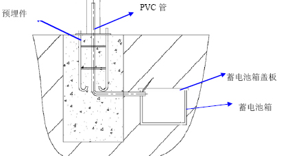 2、4、地基預(yù)埋件放入地基澆筑坑的中間,將PVC塑料管的一端放在蓄電池箱內(nèi),在將PVC塑料管的另一端放在基礎(chǔ)結(jié)構(gòu)件固定底版中心穿出0.2米。一切準(zhǔn)備就緒,用C20混凝土澆灌后用震動棒震動即可。
