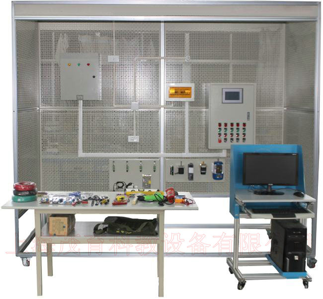 本設備可進行電工安裝。如橋架安裝、PVC管安裝、吊燈、白熾燈座、日光燈、開關、插座、配電箱、控制箱等,裝置還包含有交流異步電動機、直流電動機、步進電機、伺服電機、溫度控制器、電偶、PLC、變頻器觸摸屏。該系統(tǒng)每個操作組配套一可移動式工具車和元件柜,便于對元件的保管和安裝施工。從根本上解決了學校在普通墻面上進行的安裝培訓的使用不方便、實訓范圍窄的問題