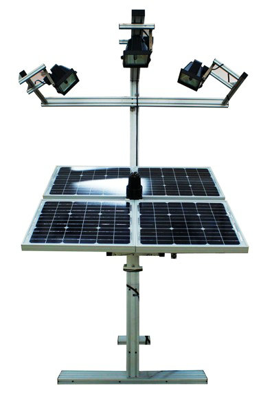 光源模擬跟蹤控制系統(tǒng)控制燈光來模擬太陽光源(晨日太陽、午日太陽、夕日太陽)的運(yùn)行軌跡以及太陽光的入射角度,太陽能電池板上的模擬追日跟蹤傳感器采集模擬太陽光照度信息及位置信息,控制兩維運(yùn)動機(jī)構(gòu),使太陽能電池板始終正對著模擬太陽光源,以提高太陽能電池的發(fā)電效率。